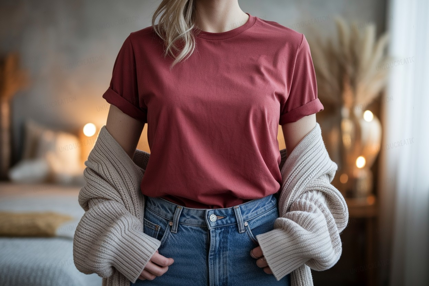 Similar Design Products to Woman wearing maroon t shirt and blue jeans