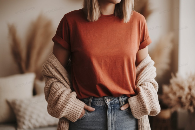Similar Design Products to Orange t shirt and beige cardigan mockup