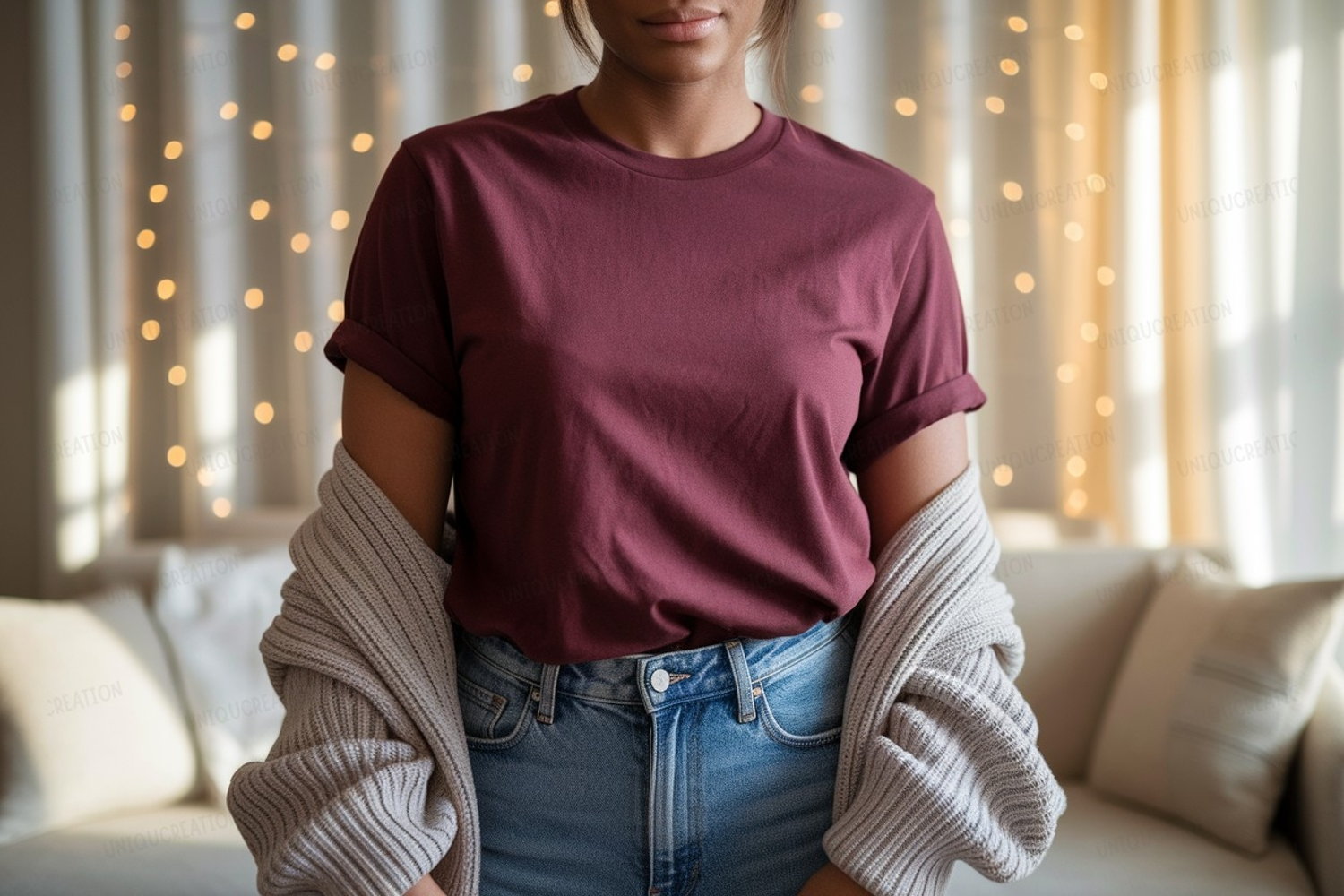 Stylish Fashion Clothing Casual Mockup Woman Tee Denim Comfortable Crimson