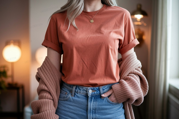 Fashion Clothing Casual Mockup Apparel Tee Blue Jeans Cardigan Terracotta