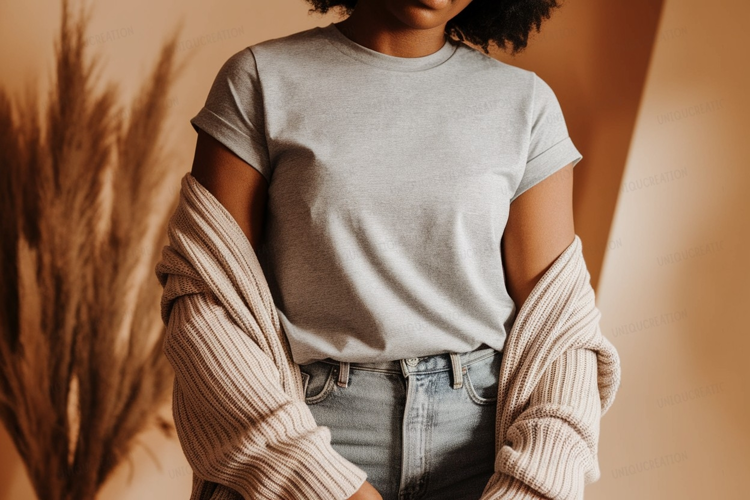 Similar Design Products to Woman wearing grey t shirt and beige cardigan image