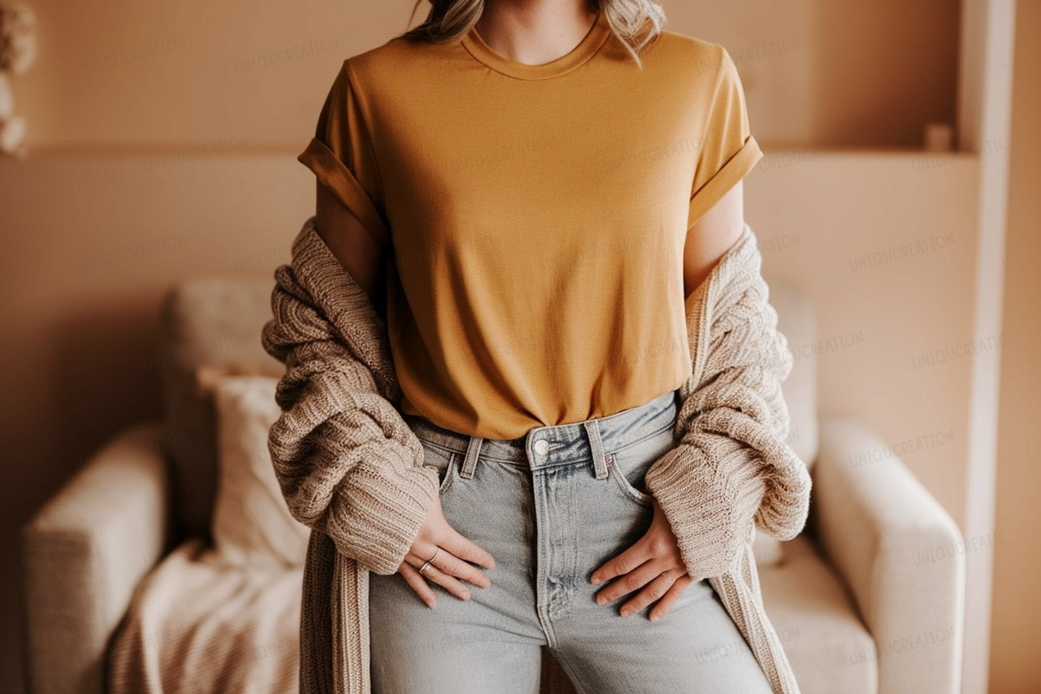 Similar Design Products to Mustard shirt light denim jeans knit cardigan mockup