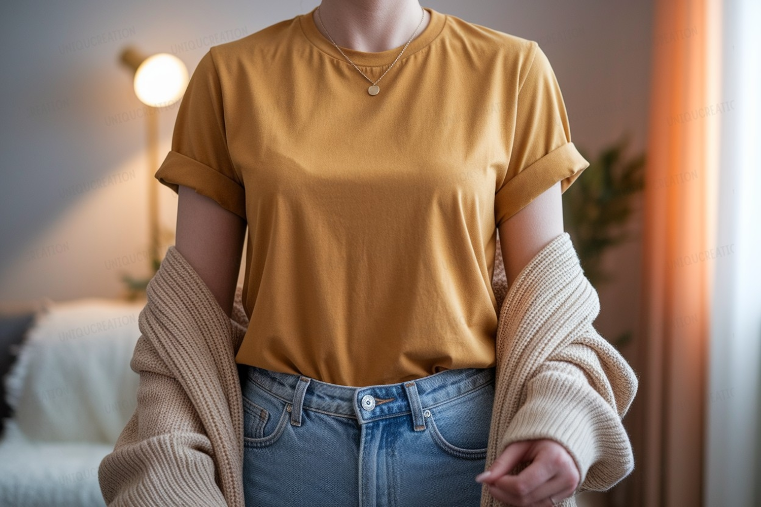 Mustard tee light wash jeans cardigan mockup apparel example image 1