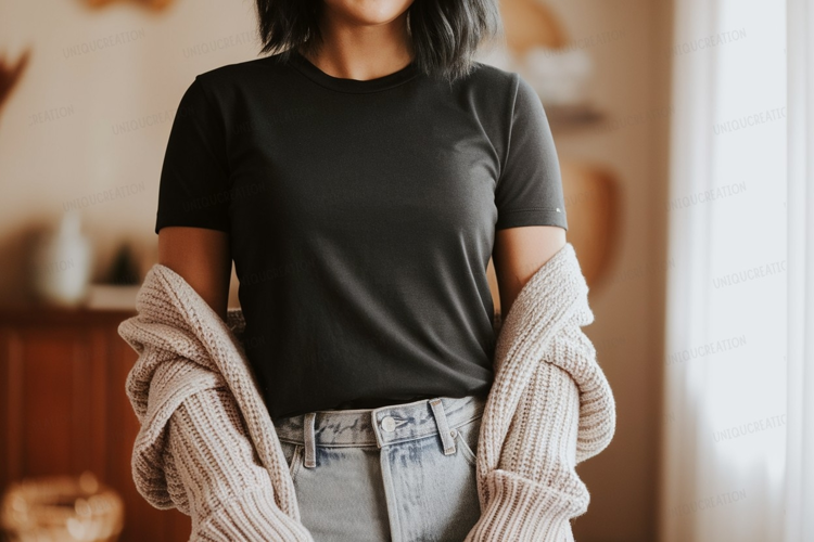 Fashion Black T-shirt Clothing Casual Mockup Woman Jeans Denim Cardigan