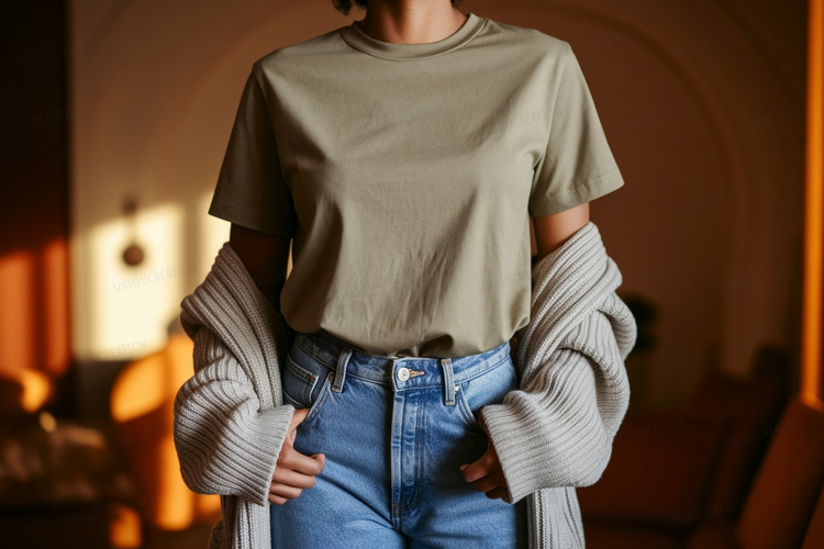 Olive t shirt denim jeans cardigan mockup image example image 1