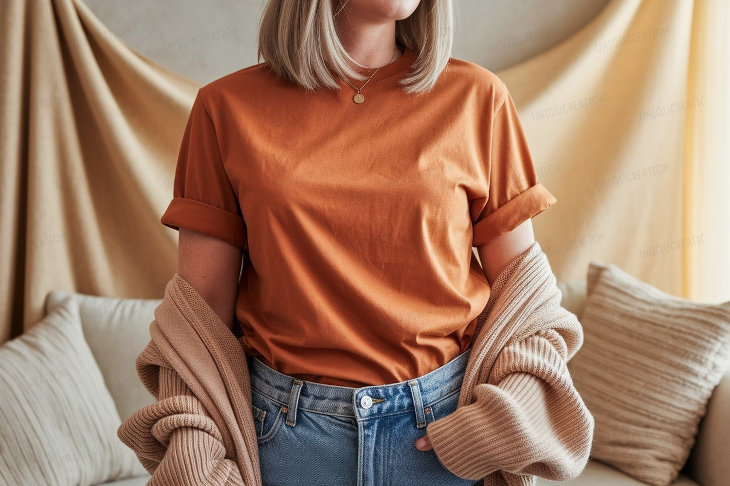 Similar Design Products to Orange tee blue jeans tan cardigan mockup image