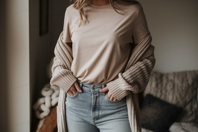 Tags: woman, man, female, male, person, fashion, clothing, apparel, casual, style, outfit, modern, chic, elegant, trendy, aesthetic, cozy, comfortable, soft, textured, knitwear, sweater, cardigan, knit, layered, cotton, fabric, stylish, everyday, relaxed, lifestyle, indoor, home, natural, light, shadows, studio, portrait, mockup, display, product, presentation, garment, simple, clean, neutral, background, upper body, torso, model, photo, image, picture, aesthetic, interior, decor, couch, pillows, vase, reeds, room