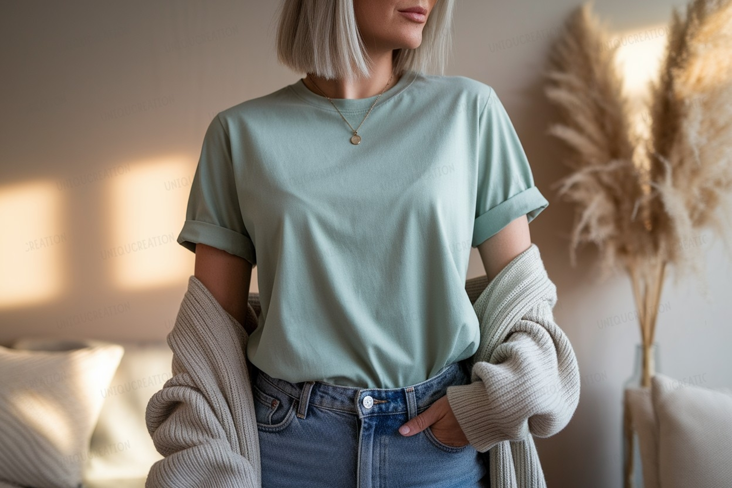 Fashion Lifestyle T-shirt Clothing Casual Green Mockup Woman Jeans Indoor