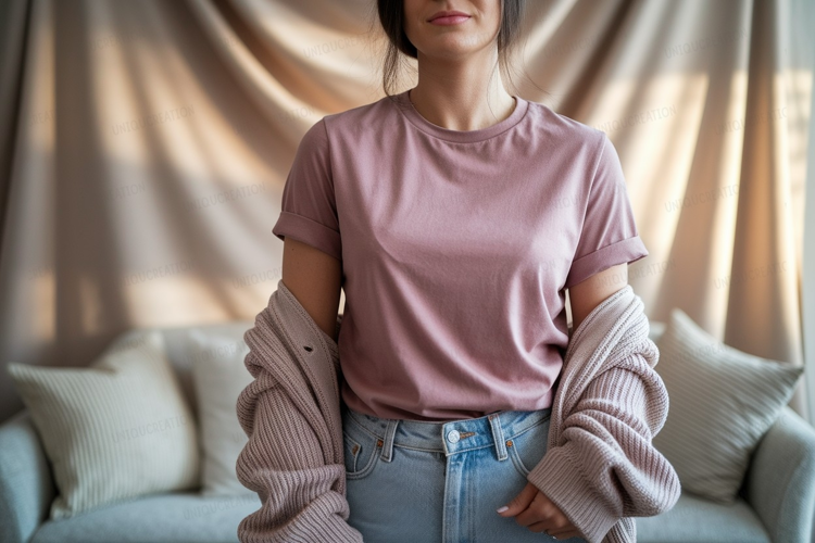 Similar Design Products to Woman wearing pink t shirt and cardigan image