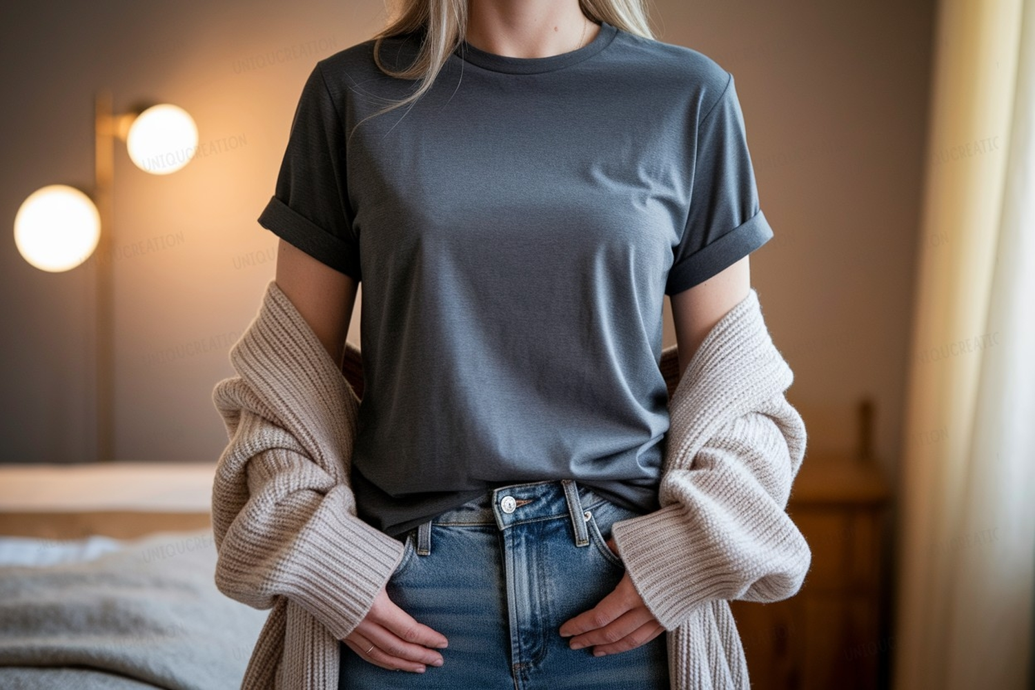 Similar Design Products to Grey t shirt mockup with cardigan and jeans