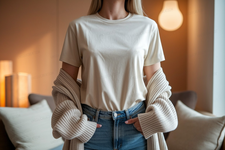 Similar Design Products to Cream shirt blue jeans cardigan mockup image