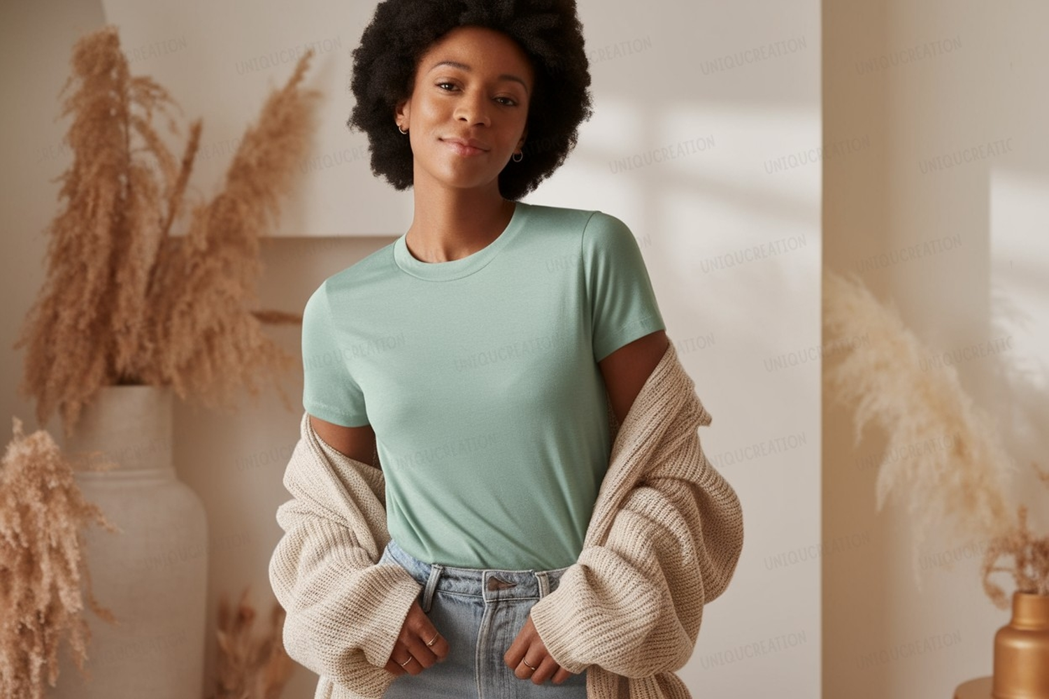 Tags: woman, man, female, male, person, fashion, clothing, apparel, casual, style, outfit, modern, chic, elegant, trendy, aesthetic, cozy, comfortable, soft, textured, knitwear, sweater, cardigan, knit, layered, cotton, fabric, stylish, everyday, relaxed, lifestyle, indoor, home, natural, light, shadows, studio, portrait, mockup, display, product, presentation, garment, simple, clean, neutral, background, upper body, torso, model, photo, image, picture, aesthetic, interior, decor, couch, pillows, vase, reeds, room