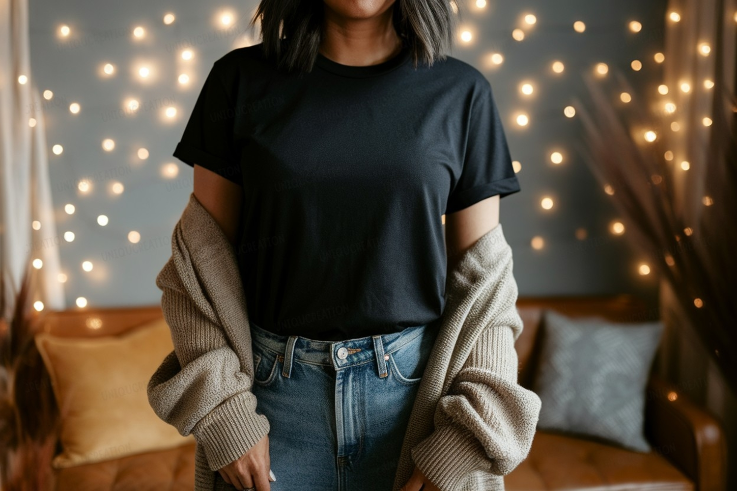 Black shirt denim jeans cozy cardigan mockup apparel example image 1