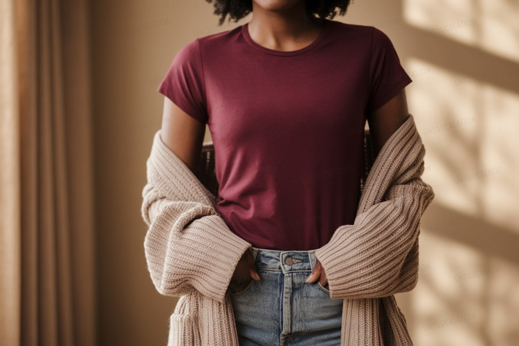 Similar Design Products to Maroon t shirt and beige cardigan mockup image