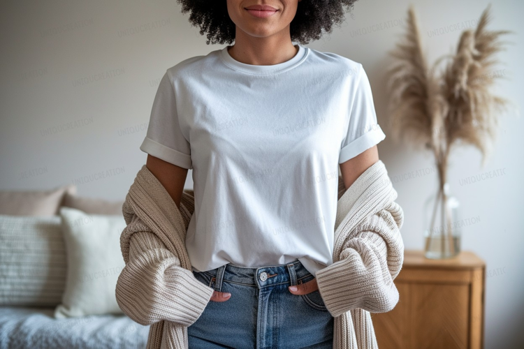 Similar Design Products to Woman wearing white t shirt and jeans Mockup