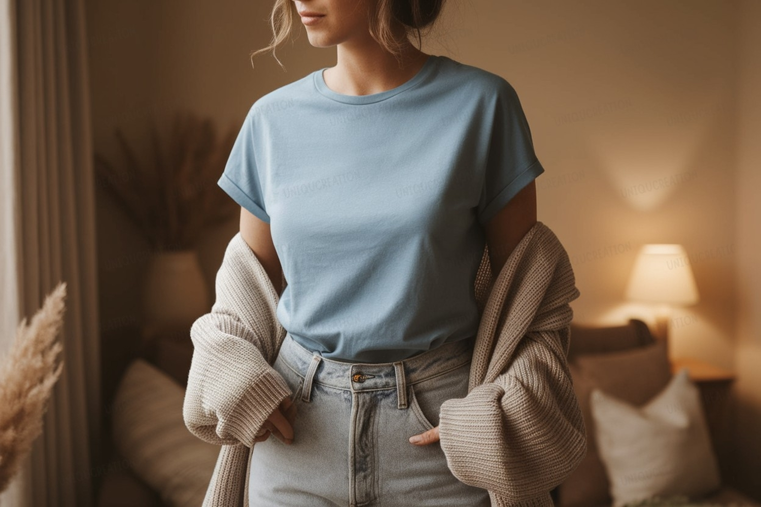 Similar Design Products to Woman wearing blue t shirt and cardigan
