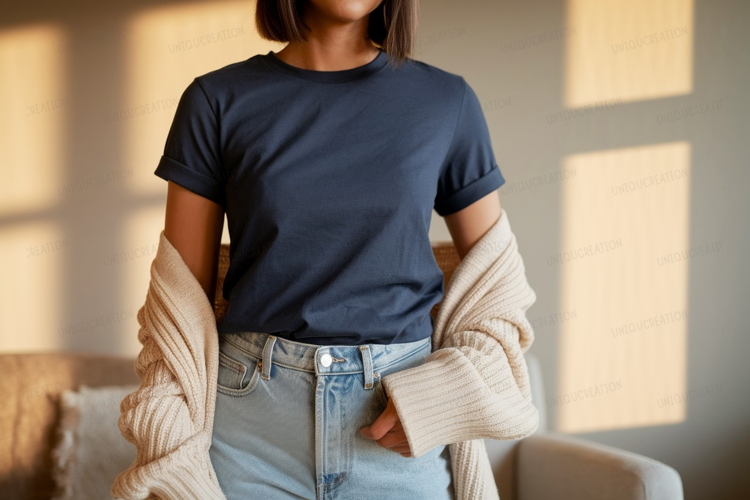 Similar Design Products to Woman wearing dark blue t shirt and light cardigan