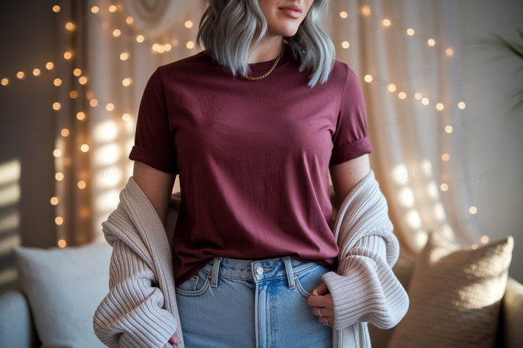 Maroon tee light cardigan denim jeans example image 1