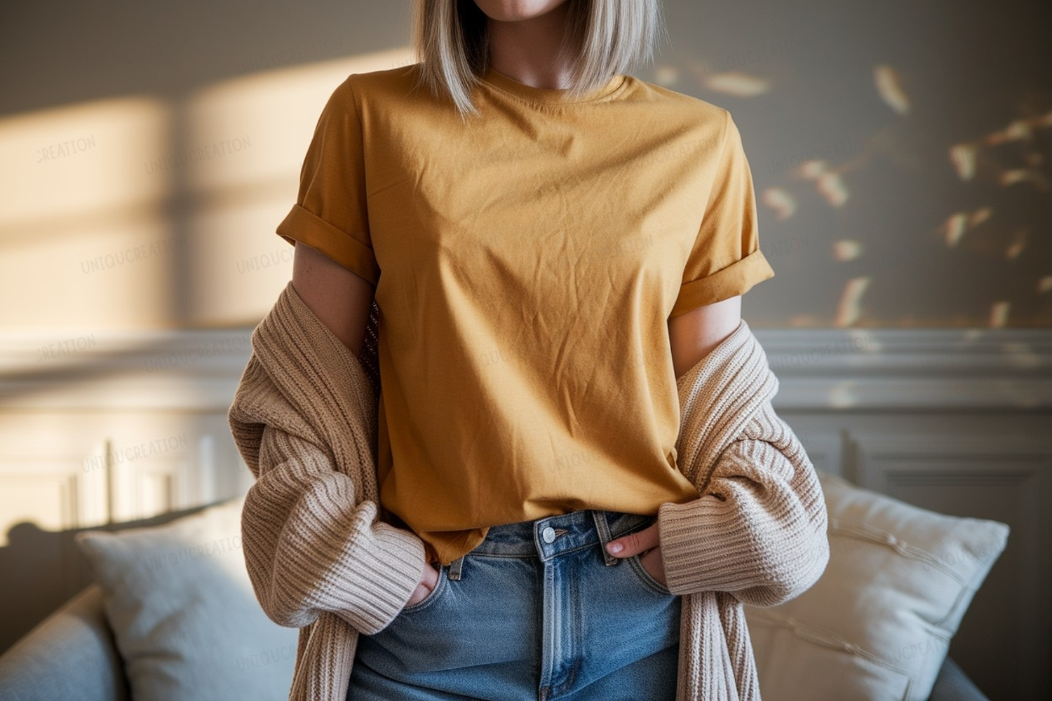 Fashion T-shirt Clothing Casual Mockup Apparel Woman Yellow Beige Mustard