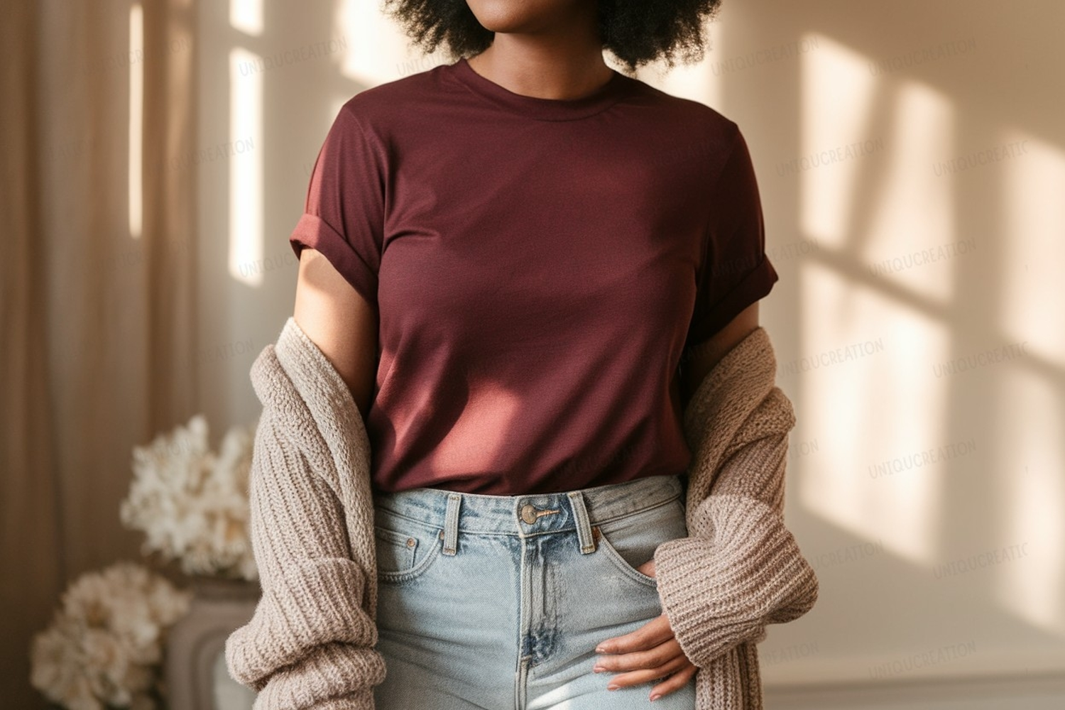Maroon t shirt light wash denim Mockup example image 1
