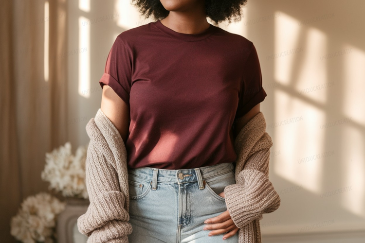 Maroon t shirt light wash denim Mockup