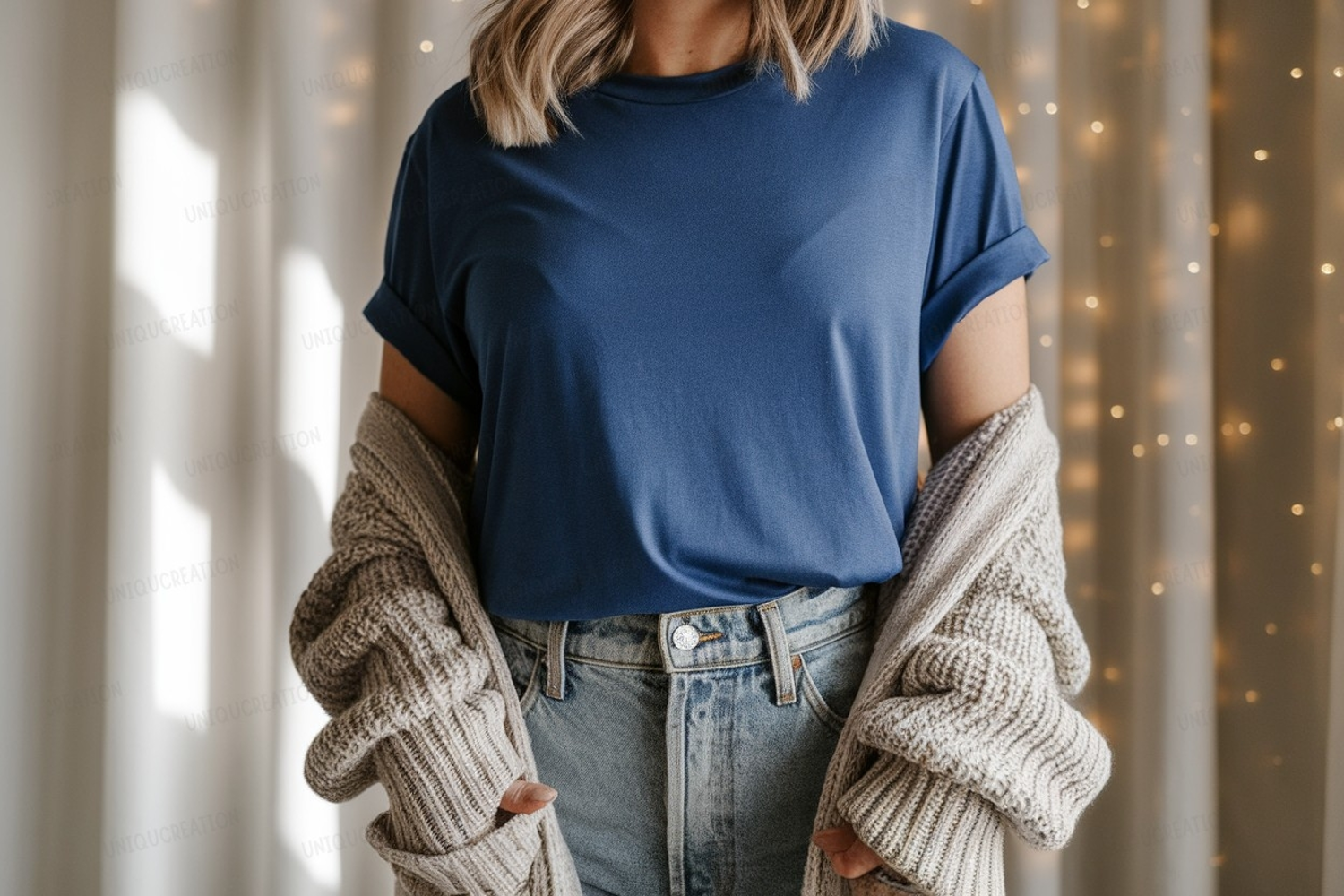 Similar Design Products to Blue tee and knit cardigan mockup image