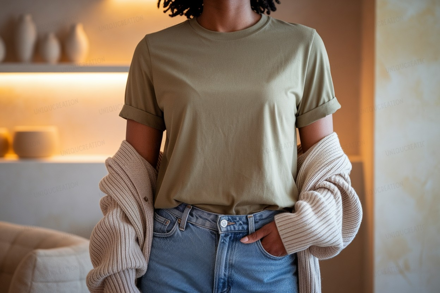 Similar Design Products to Olive green t shirt and denim jeans mockup image