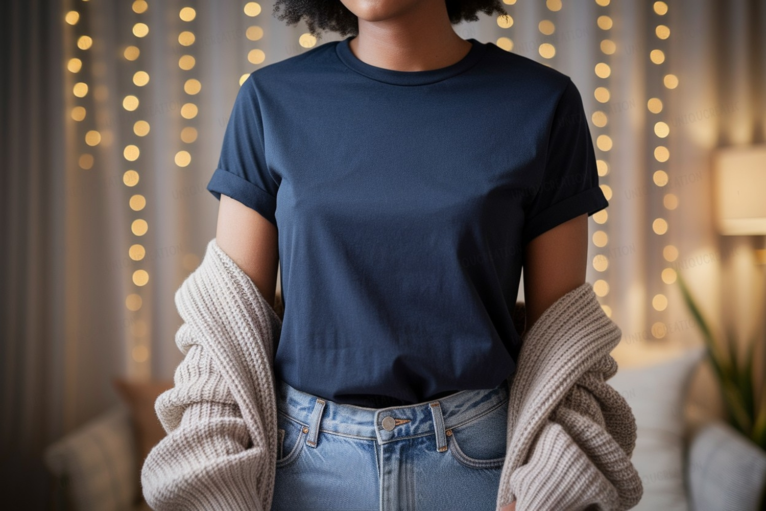 Similar Design Products to Dark blue t shirt mockup with cozy cardigan image