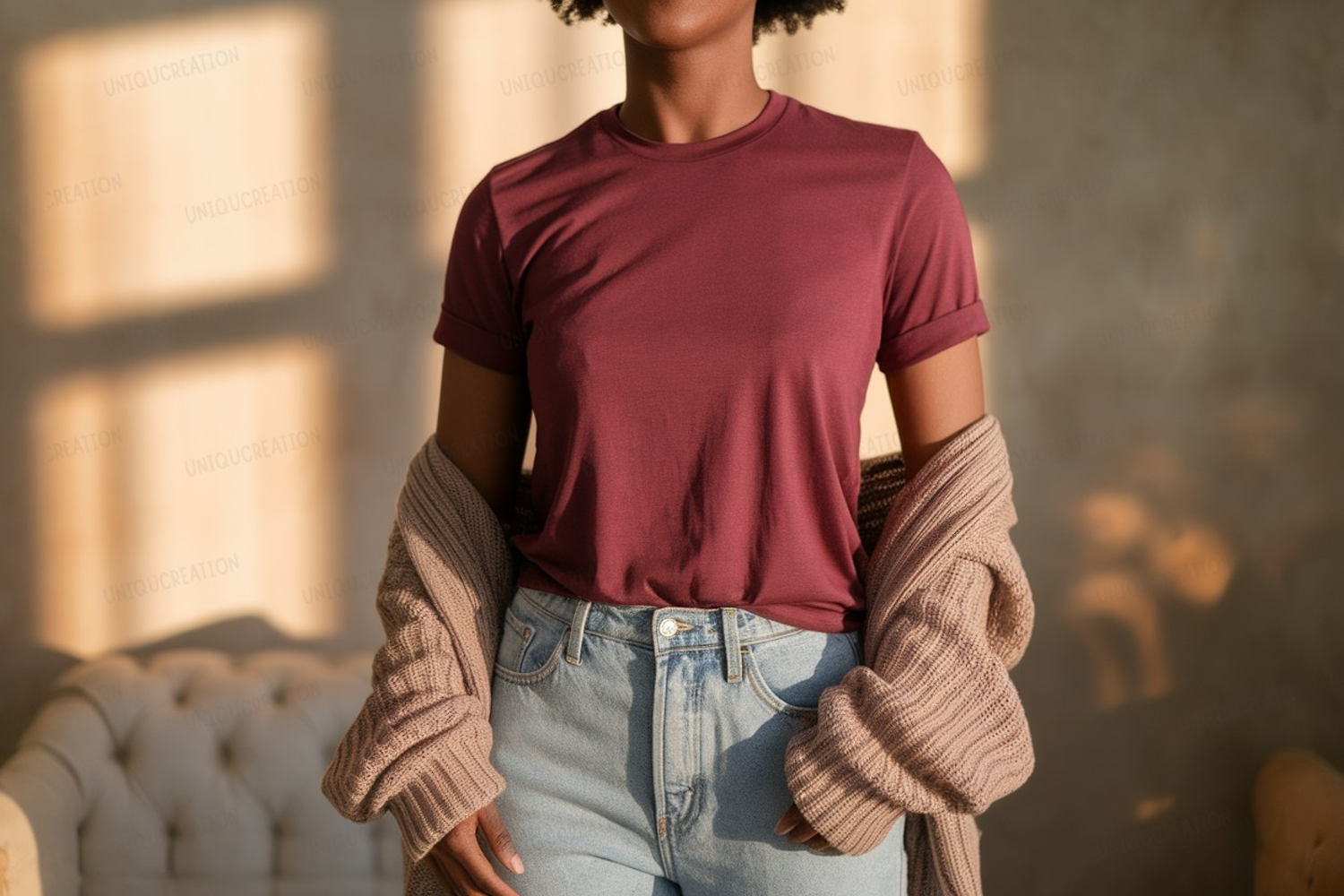 Similar Design Products to Woman wearing maroon t shirt and light jeans image