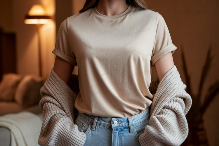 Fashion Shirt Clothing Casual Mockup Woman Jeans Beige Denim T