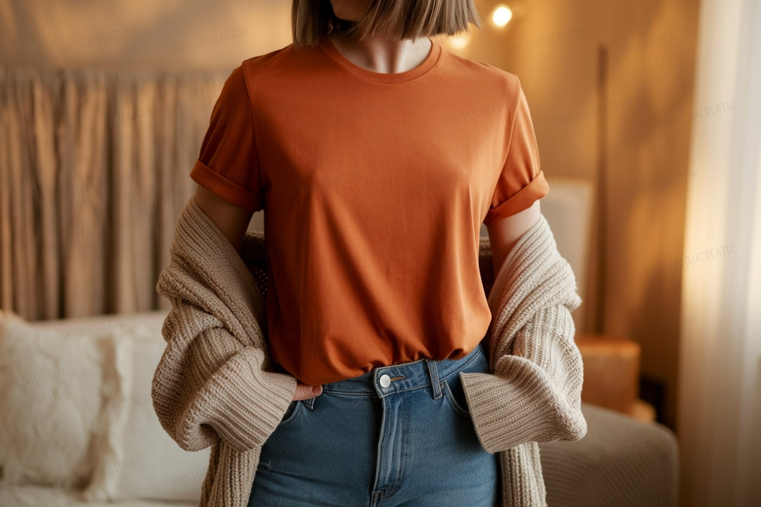 Orange t shirt blue jeans cozy cardigan image example image 1