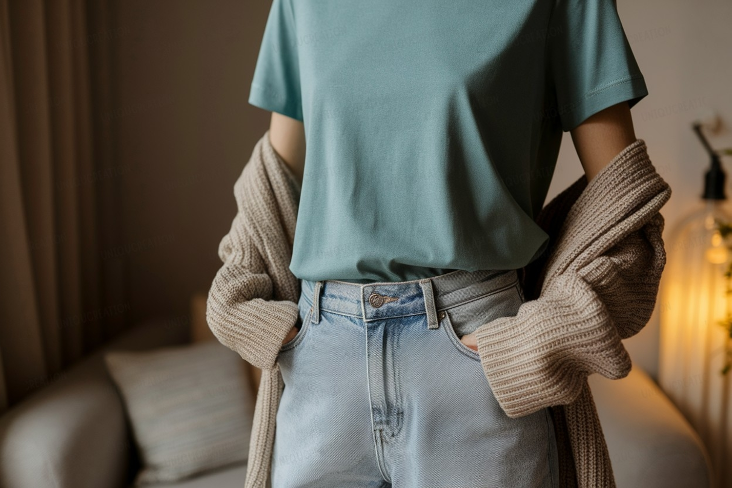 Similar Design Products to Teal t shirt light denim jeans beige cardigan image