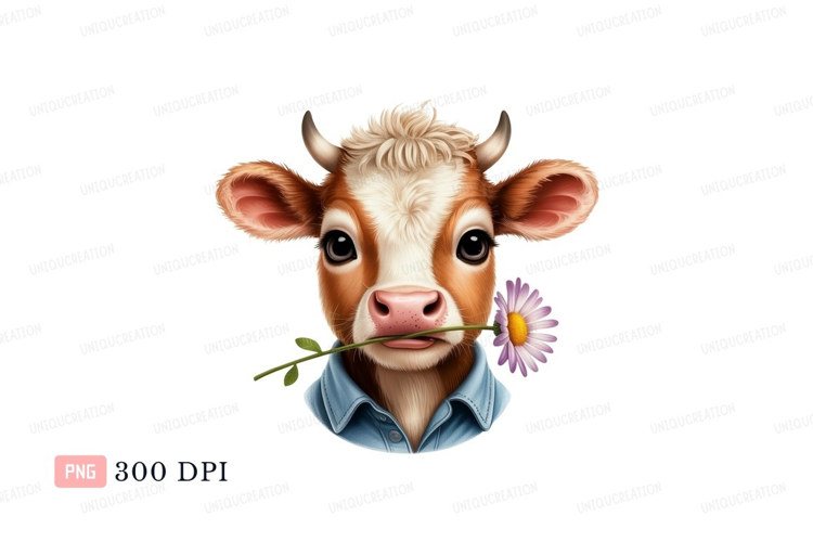 Adorable cow wearing blue shirt holding flower calf example image 1