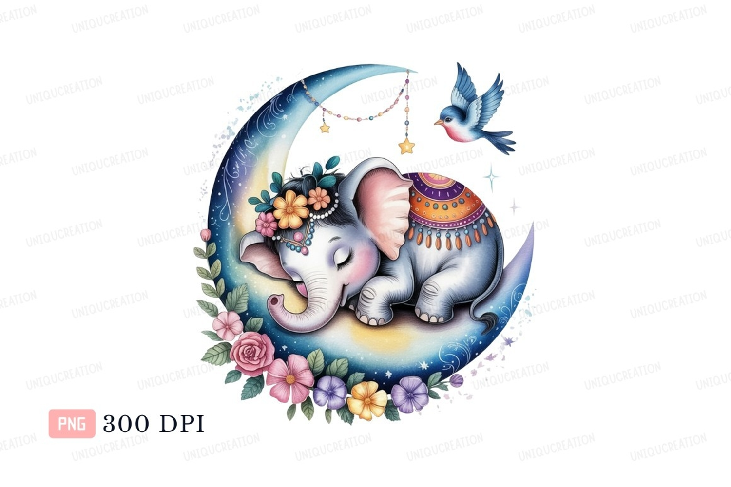 Sleeping elephant on moon with bird crescent example image 1