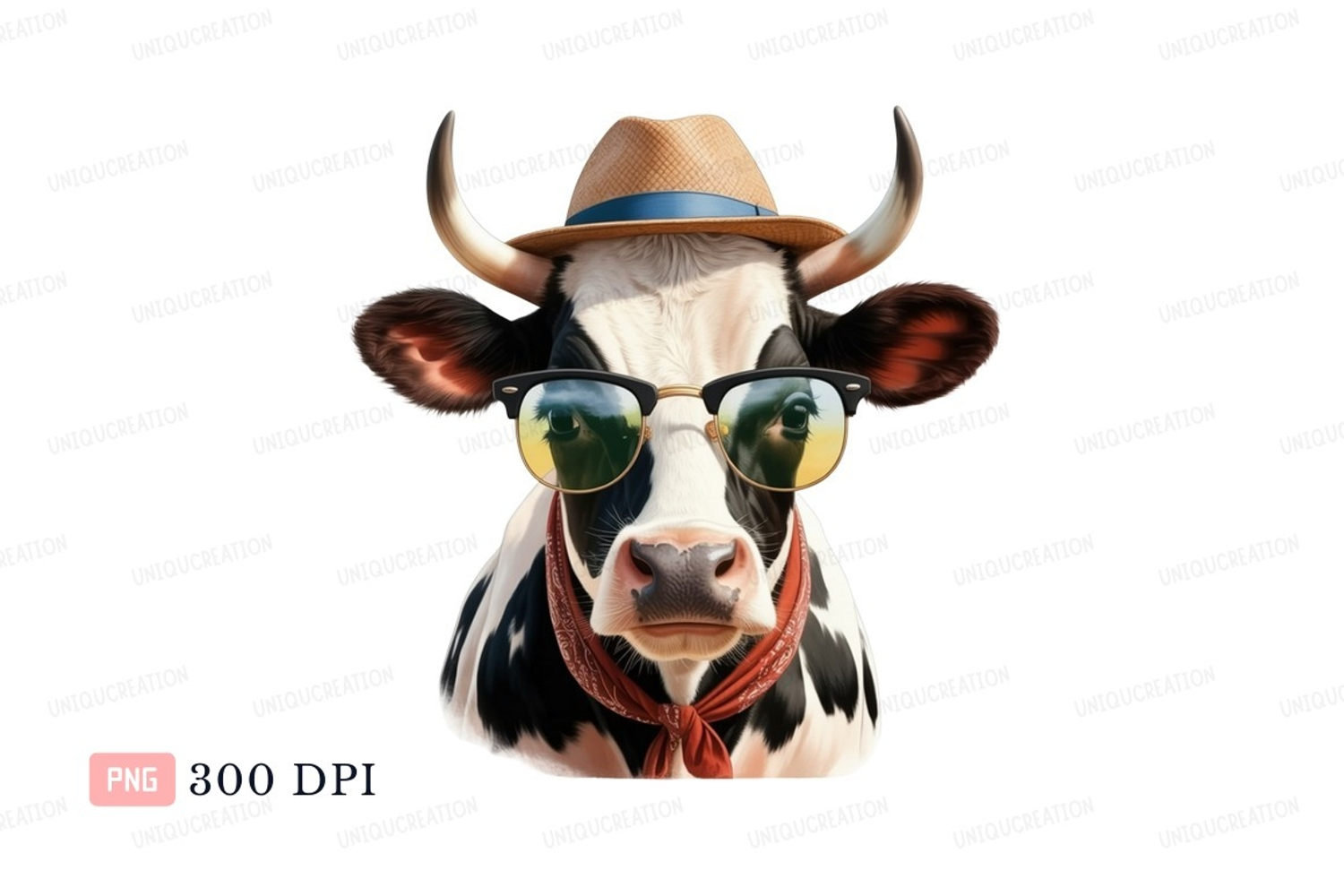 Stylish cow wearing hat and sunglasses bandana farm example image 1