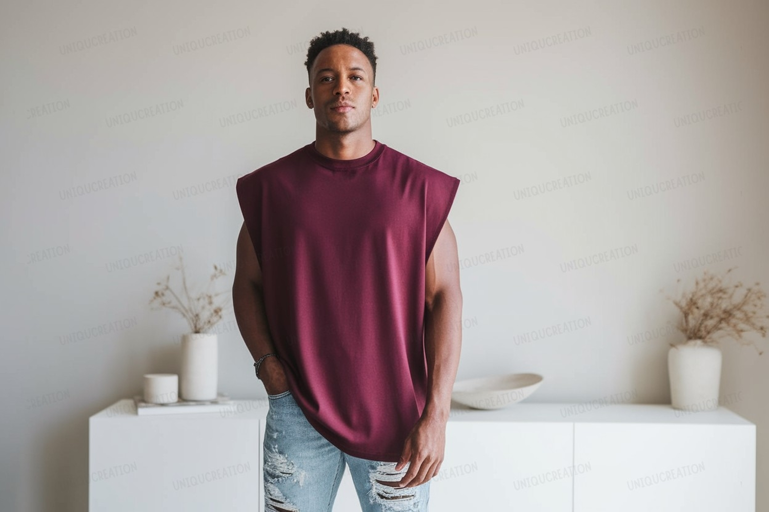 Fashion Man Shirt Clothing Casual Mockup Jeans Maroon Ripped Sleeveless