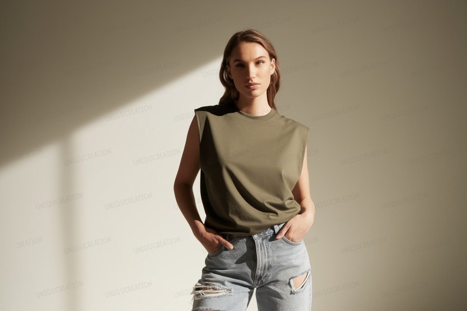 Light Shirt Green Mockup Woman Background Jeans Olive Ripped Sleeveless