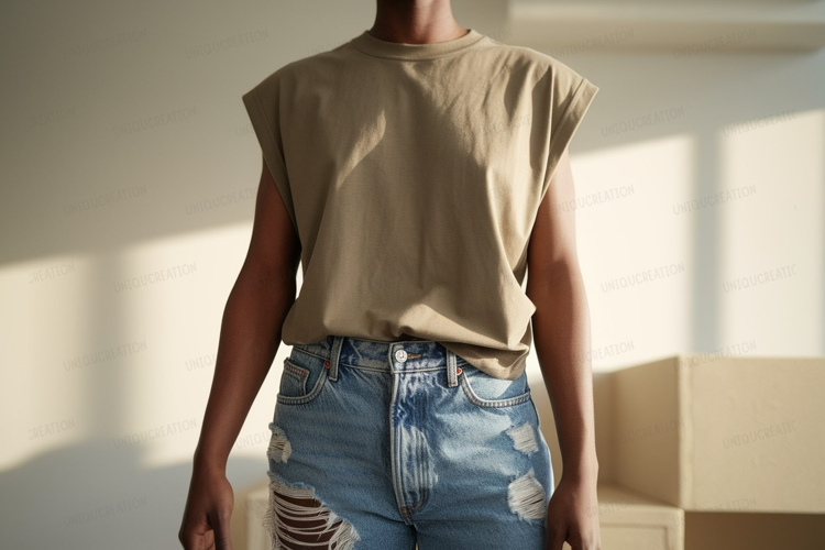 Fashion Shirt Clothing Casual Mockup Person Tan Denim Ripped Shorts