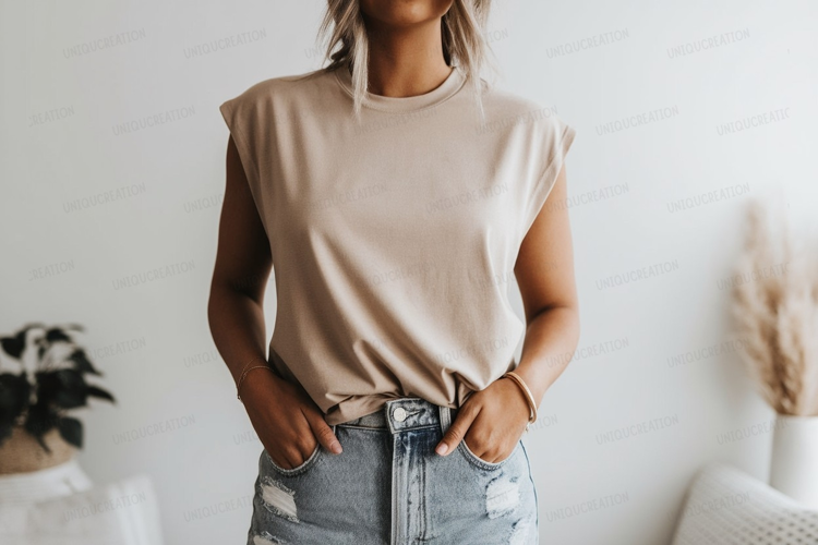 Fashion Style Shirt Clothing Casual Mockup Woman Tan Denim Shorts