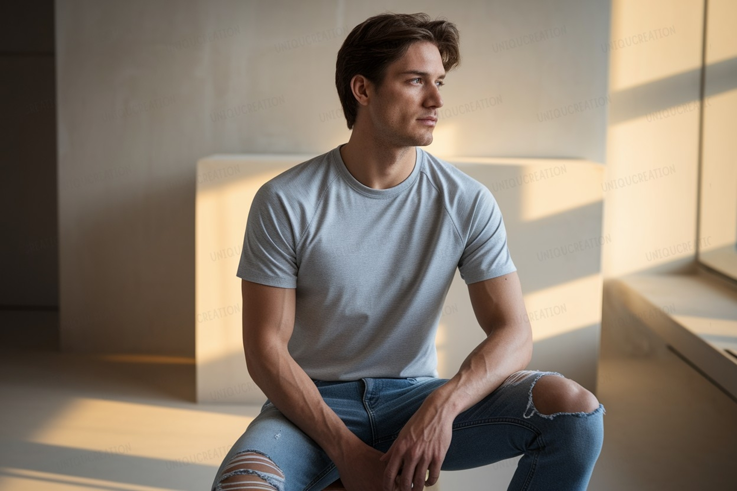 Similar Design Products to Man wearing grey t shirt ripped jeans image