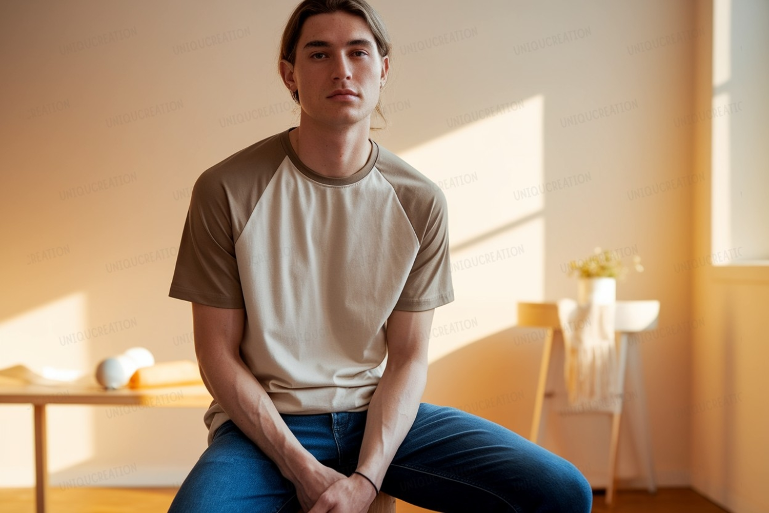 Man wearing raglan t shirt blue jeans image example image 1