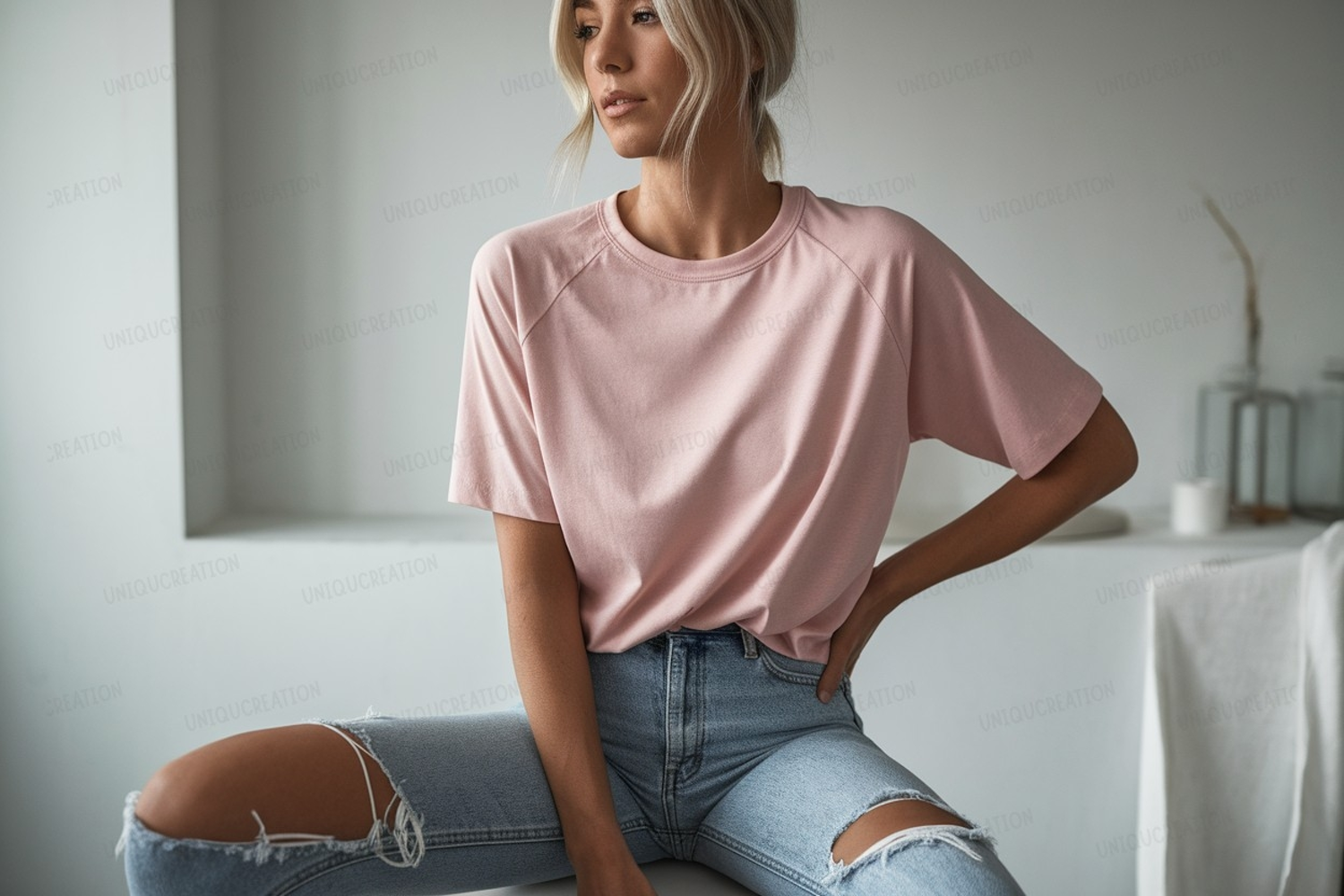Pink tee ripped jeans mockup woman t-shirt