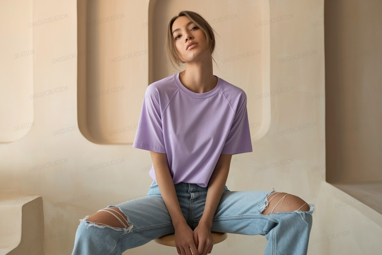 Similar Design Products to Woman wearing lavender t shirt ripped jeans image