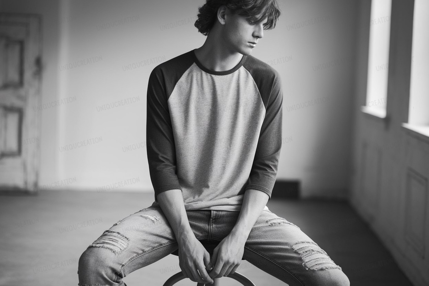 Similar Design Products to Young man wearing baseball shirt and ripped jeans