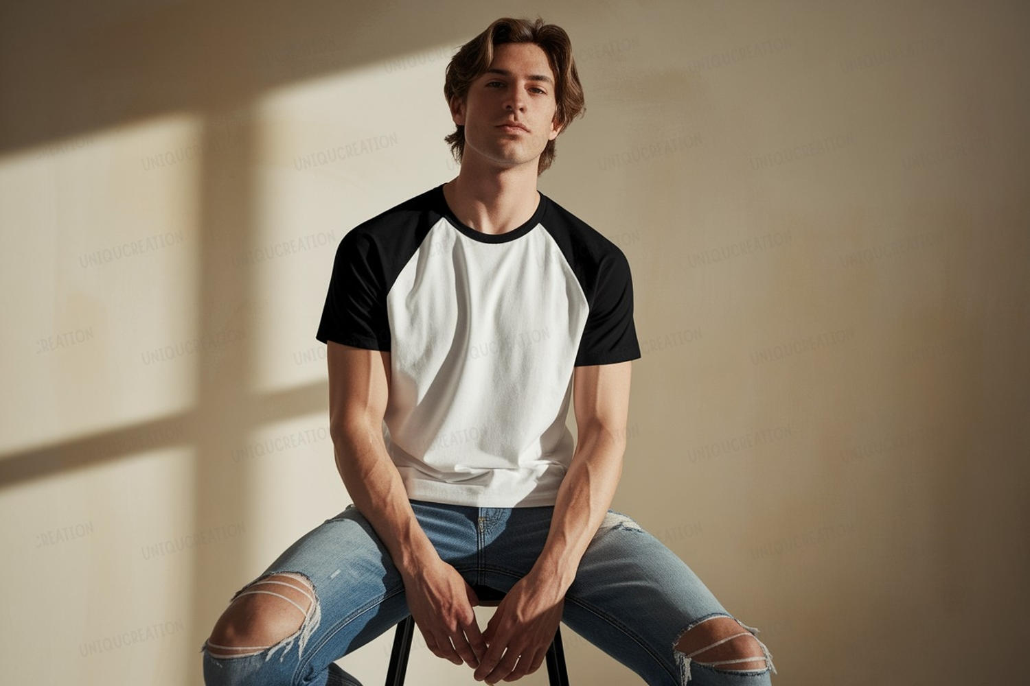 Similar Design Products to Young man wearing baseball shirt and ripped jeans