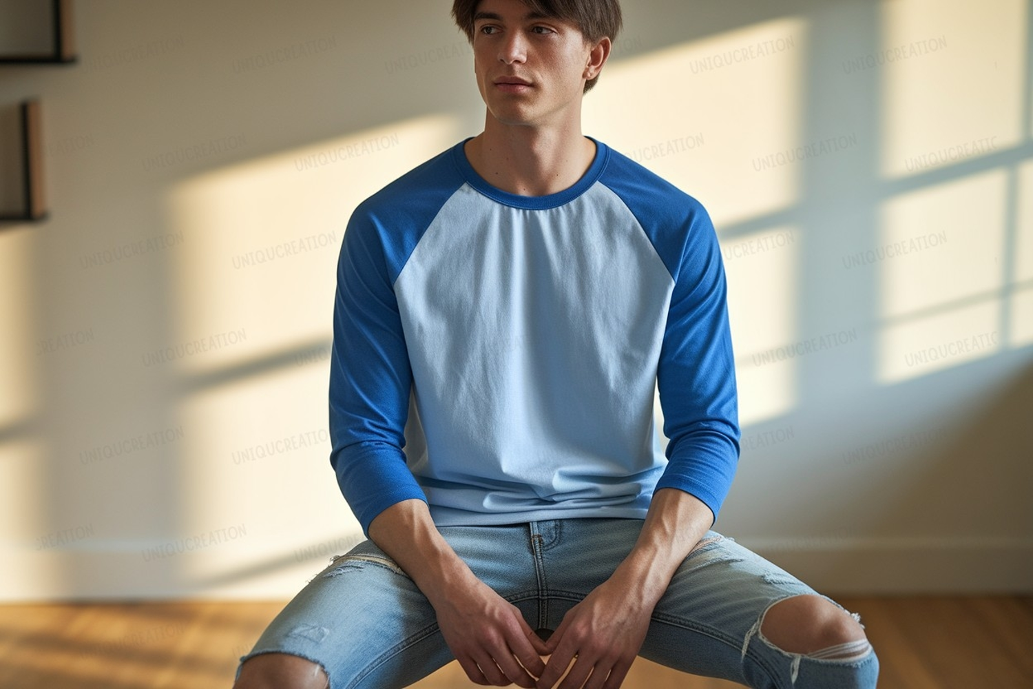 Similar Design Products to Young man wearing blue raglan shirt and ripped jeans