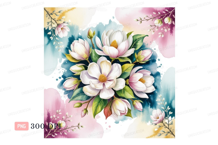 White pink magnolia blossoms watercolor green example image 1