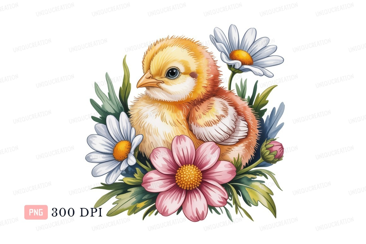 Fluffy chick surrounded by flowers yellow orange example image 1