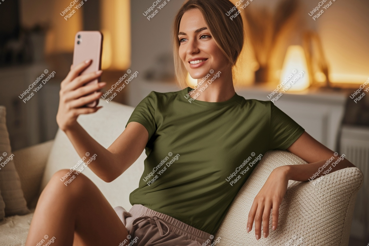 T-shirt Casual Green Woman Home Phone Indoor Selfie Relaxed Sofa