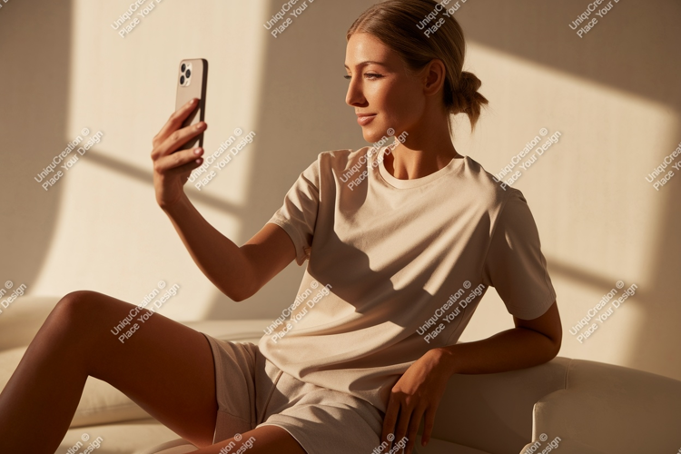 Light Clothing Casual Mockup Woman Phone Indoor Comfortable Selfie Relaxed